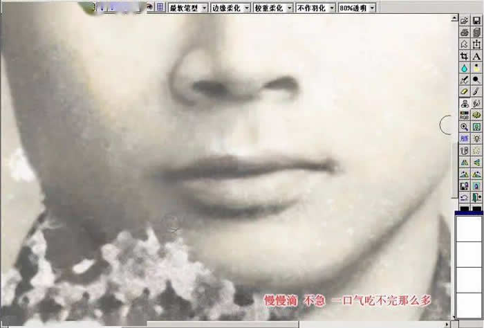 12.此图片最难处理的部分下巴,先将小的脏点漫漫处理掉再去处理比较大的脏块